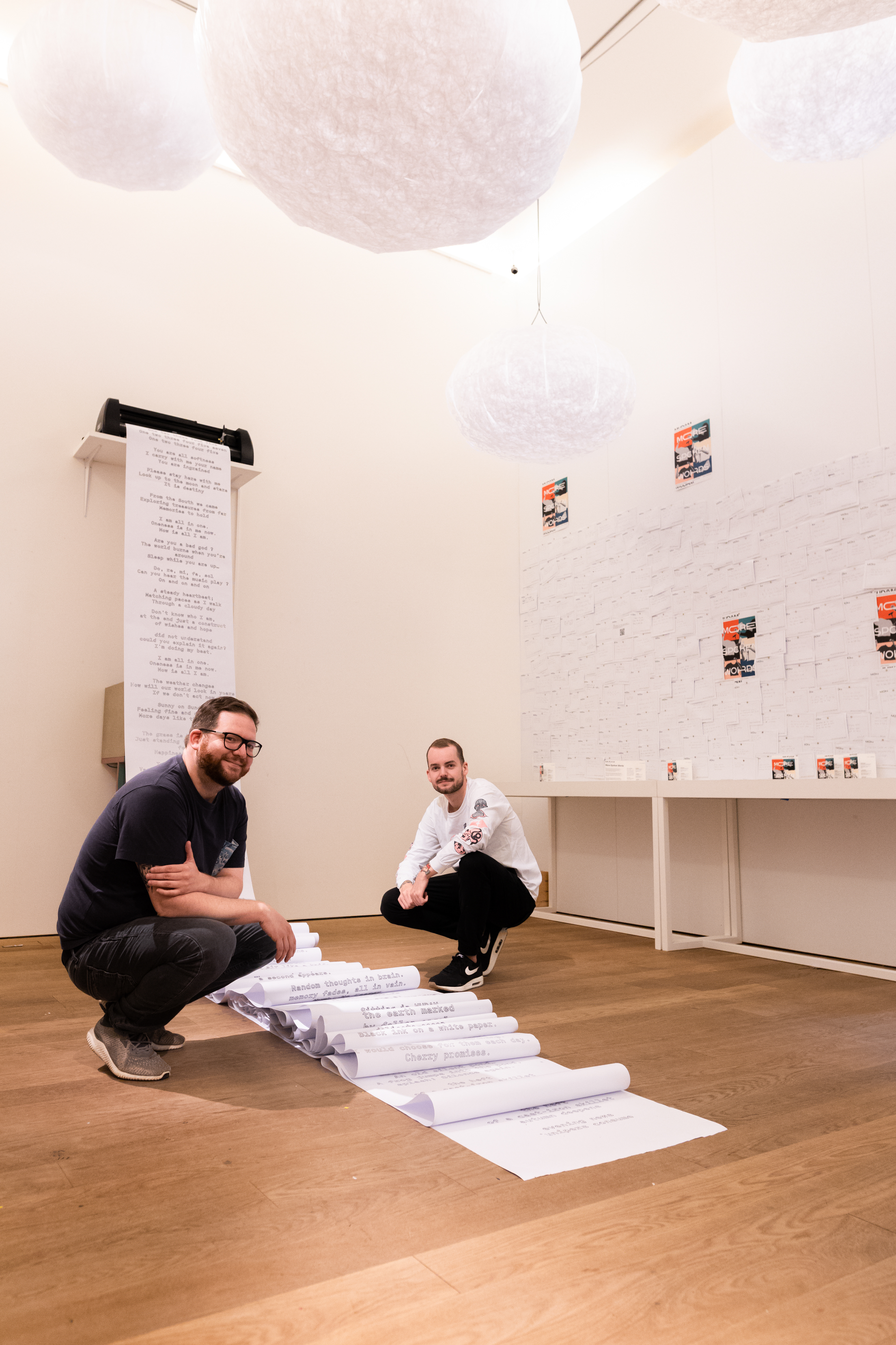 Haiku poems are a Japanese form of syllable poetry that consists of 5 syllables in the first line, 7 syllables in the second and 5 syllables in the third. A total of more than 500 Haikus will have been generated by an AI, written by ourselves and the audience of the MUDAM. These were printed by a large scale plotter on a seemingly endless roll of over 100 metres of paper.